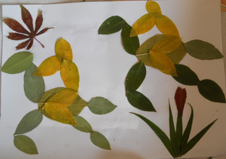 随后,我又同宝宝一起做了一个树叶画,不过,这幅画是宝宝来当副手,提供树叶,我则来粘帖。做好后,我们在欣赏画的时候,突然发现那个鱼忘了粘眼睛了。便又取来树叶找了合适的充当了鱼的眼睛。这下总算是全部都完成了。