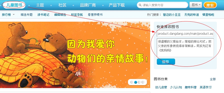 3、把从当当复制过来的链接地址,粘贴到 图书频道 右侧的分享框内,或者社区首页,别忘了加上自己推荐理由哦,然后点击推荐。(如图)