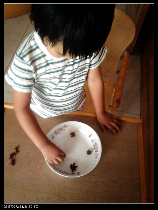 我拿来了一个盘子,又找到些大料,指导宝宝先用四个大点的上下左右定位,然后每个空挡中间填两粒小的,时间标志就有了。指针让我们动了点脑筋,宝宝自己用塑料片弄了个弯弯曲曲的指针,老爸的意见是钥匙,我翻出来个指甲刀,嘿嘿,都上来,看看图。