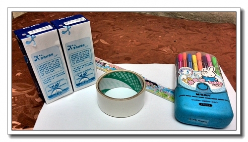 盒子2个(我们没找到合适的,就用了两瓶奶,还没喝哦)、白纸一张(实践证明,为了玩具的结实耐用,用质量好的广告纸等效果更好)、双面胶、尺子、画笔以及我忘记拍的剪刀。